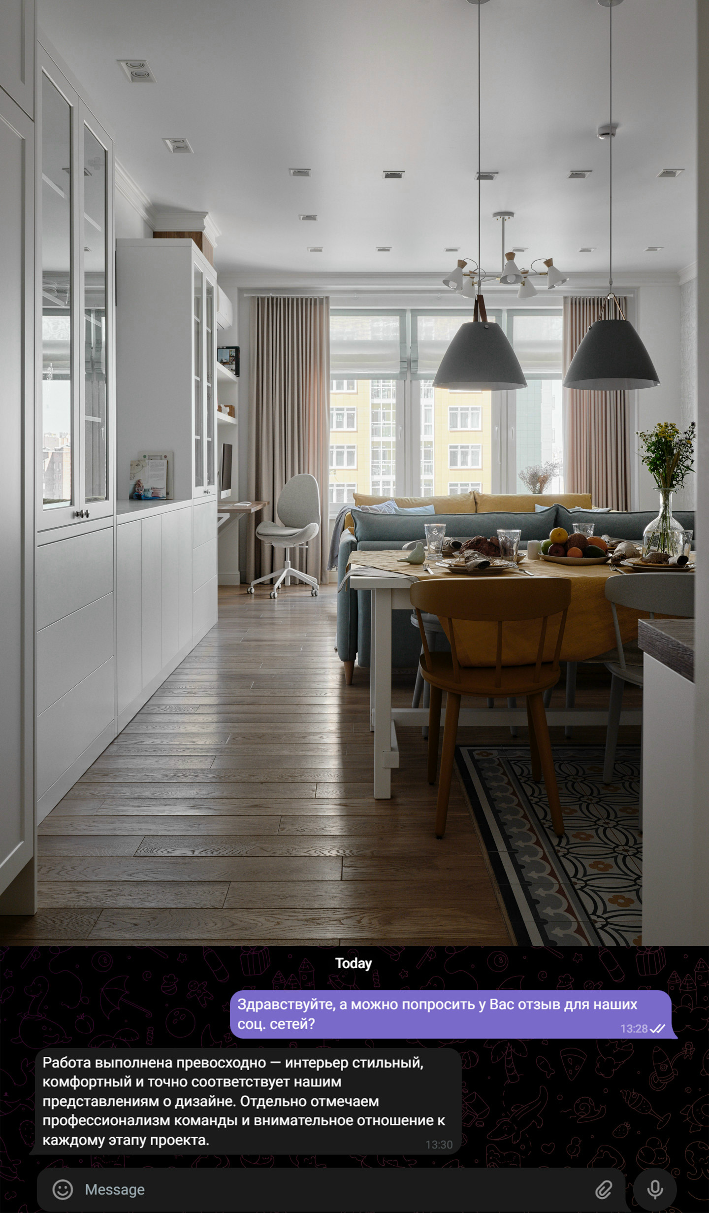 Работа выполнена превосходно — интерьер стильный, комфортный и точно соответствует нашим представлениям о дизайне. Отдельно отмечаем профессионализм команды и внимательное отношение к каждому этапу проекта.